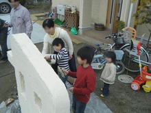 天候により延び延びになっていた、「カワイイ」オブジェと塗り壁の外構工事のジョリパッド塗りが土曜日に行われました。