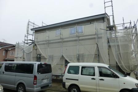 来月完成に向け、遅れていた外壁工事がほぼ完成。小雨の中サイディング屋さんががんばってくれました。お客様のご希望でデザインしたコーナー部分のアクセント張りもうまく決まってくれました。