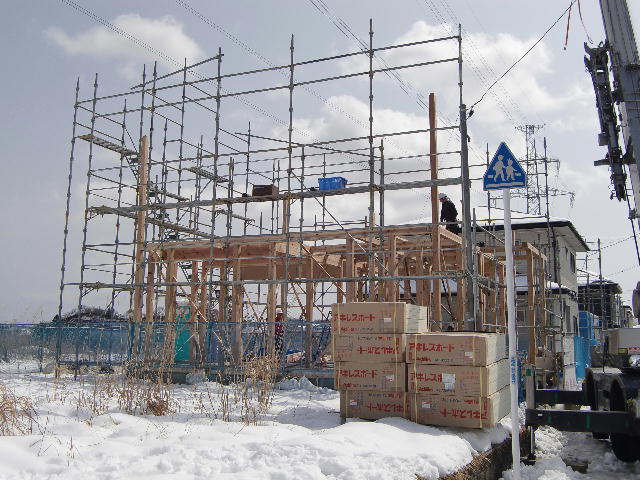 大工さんはしんどそう・・・ でも、週明けには宮城県産材の上棟検査があるのでなんとしても間に合わせなければなりません。 ※「県産材で家づくり緊急支援事業」の補助金対象住宅です。