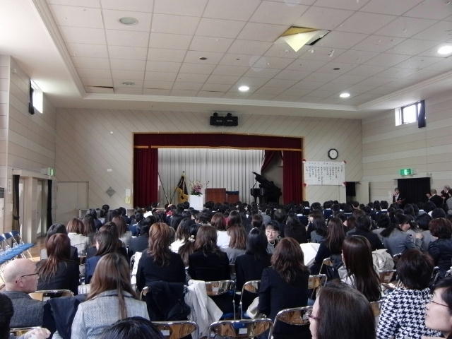 会場が狭いので、在校生は不在。 父兄も当初は全員座席なしの予定でした。(実際は、1人だけ座ることができました)