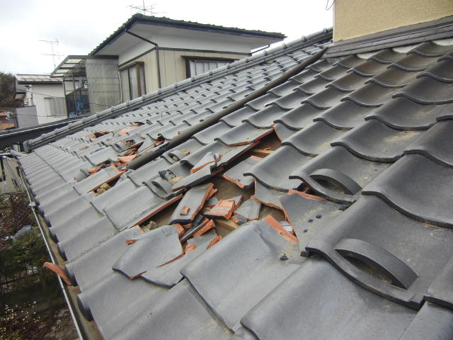 お分かりのように、今回の地震で、かなりの瓦屋根が破損しています。