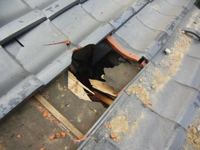 今回のお家は、瓦が落ちてきたショックで野地板まで穴が空いていました。(間違いなく雨が入りますね・・・)