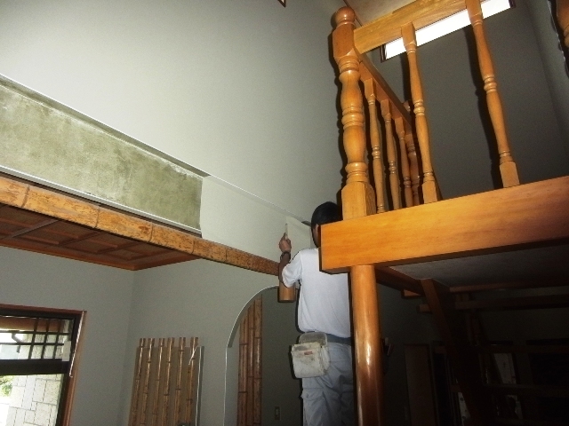 なぜわざわざクロスにしたかというと、実は吹き抜けで高い空間なのです。今後も余震等でゆすられた際にまたヒビが入ってしまうと、再び内部足場までかけなければいけません。
