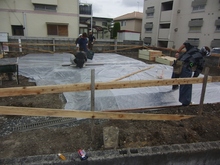 基礎屋さんは掘削が終わり、防湿シート敷きの最中でした。