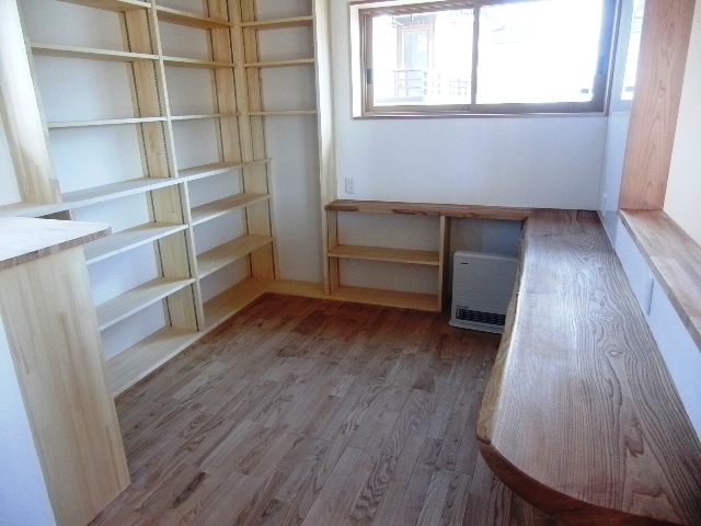 みんなの書斎・・・メインのカウンターは栗の無垢一枚板です。 床も栗フローリングとなっています。