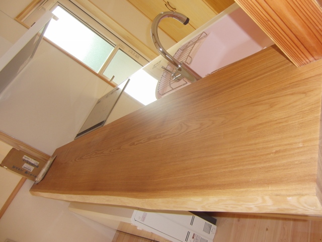 キッチン前のタモ無垢材のカウンターもなかなかよい感じです。