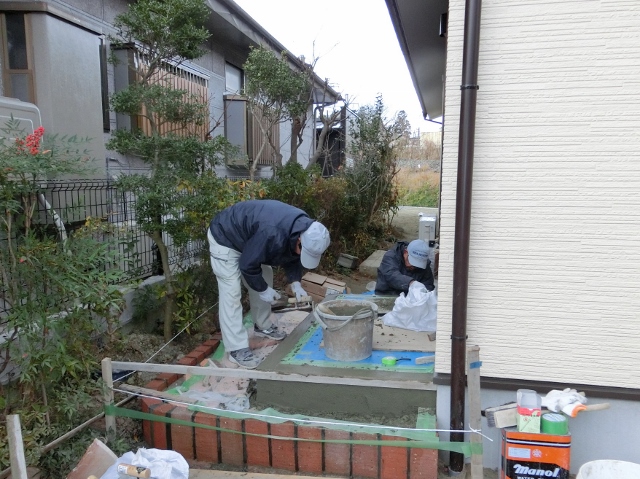 写真は、玄関ポーチの工事をする左官屋さんです。
