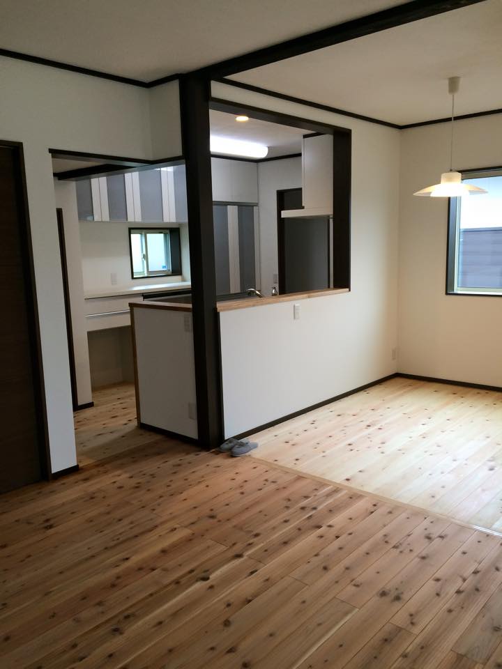 杉とヒノキのフローリング貼りわけ。天井に珪藻土を多用しました。