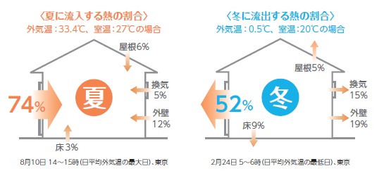 夏に流入する熱は7割が窓から、冬に流出する熱の割合は