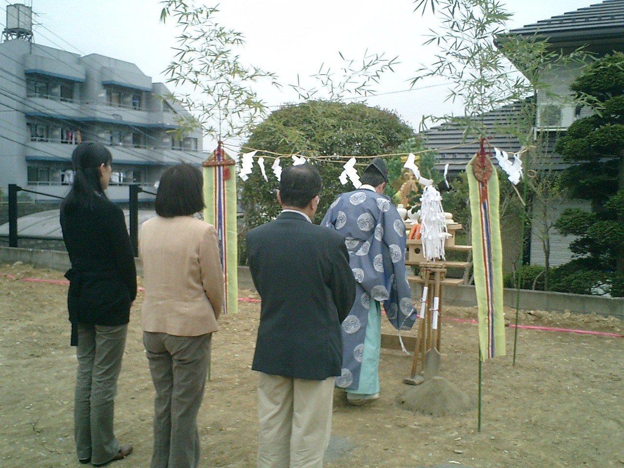 地鎮祭 2007年05月01日 今日は連休の谷間だったが、大安と言うこともあり地鎮祭。 神主さんが到着し、準備を待っている間にお祝いのお酒を持ってきたご婦人が。 「どなたですか?」と施主様にお聞きすると、「後ろの奥さんだね」とのご返事。 義理堅いというか、よいご近所づきあいをされているというか。 工事中近隣の皆様にはなにかとご迷惑をおかけしてしまうもので、意地の悪い方だと大変なのだが、今回のお隣は大丈夫そうである。