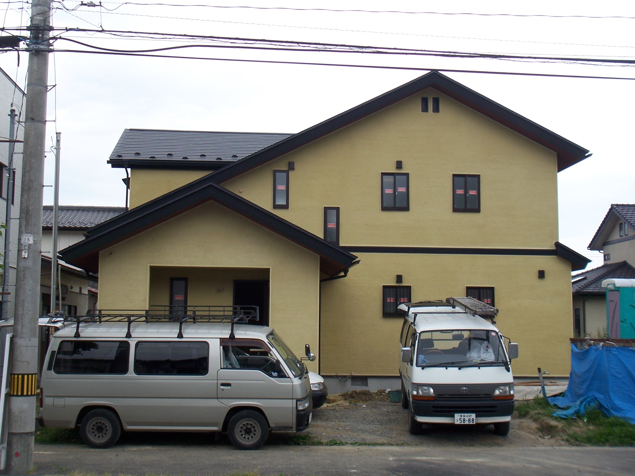 足場が外れた 2007年06月09日 引き続き岩沼の現場進行状況を。 今週いよいよ足場が外れた。 足場がなくなると、外観もはっきりしてくる。 外回りは水道配管、排水配管、ボイラー(今回はエコキュート)取付などを行う 内部も木工事が終了し(一部棚工事などが残るけれど) 内装工事が始まる。 今月末の完成を目指して、段取りが忙しくなってくる。