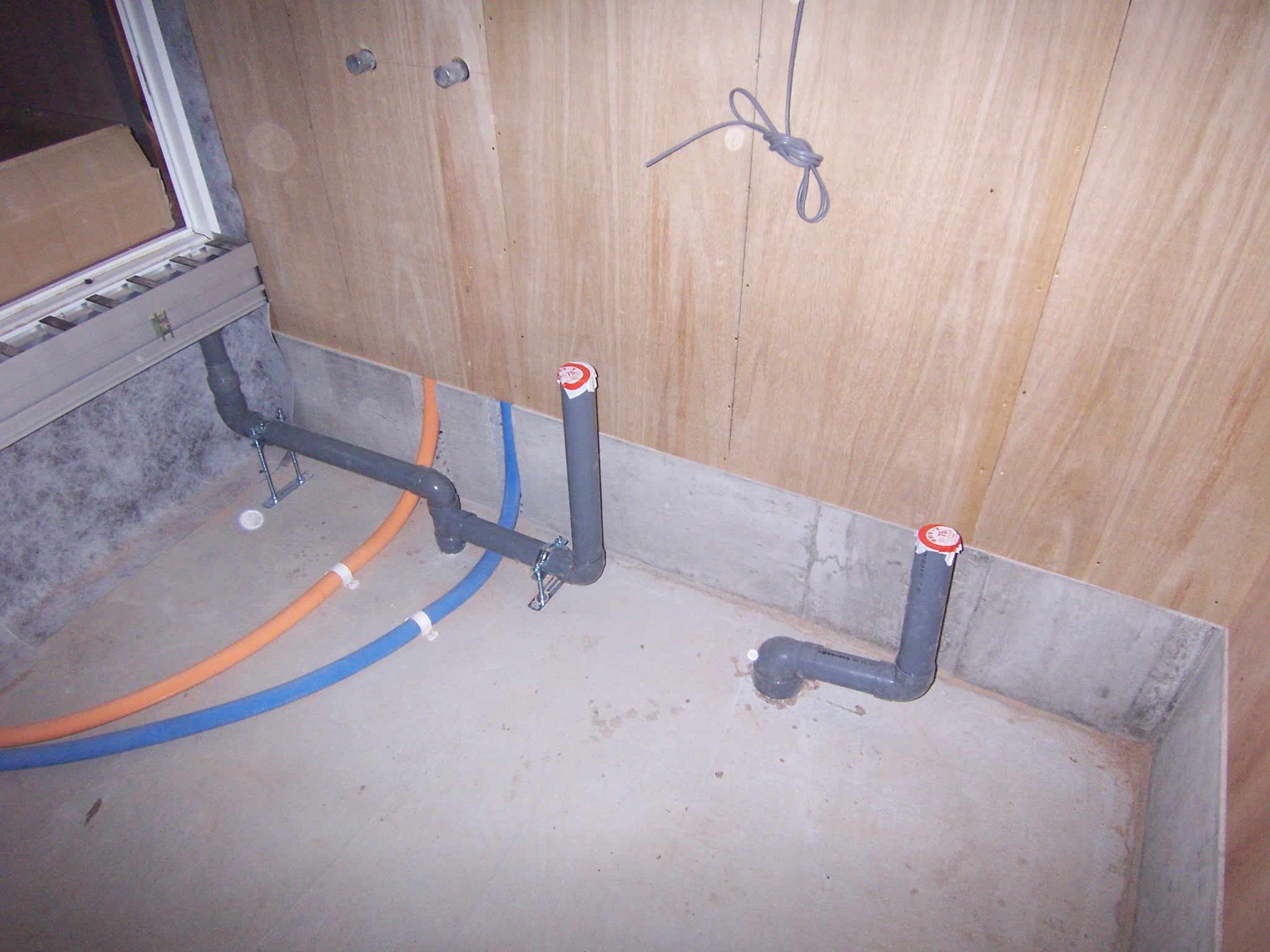 ○洗い場、浴槽、出入り口グレーチング用の排水パイプを設置、給水給湯の配管を敷設