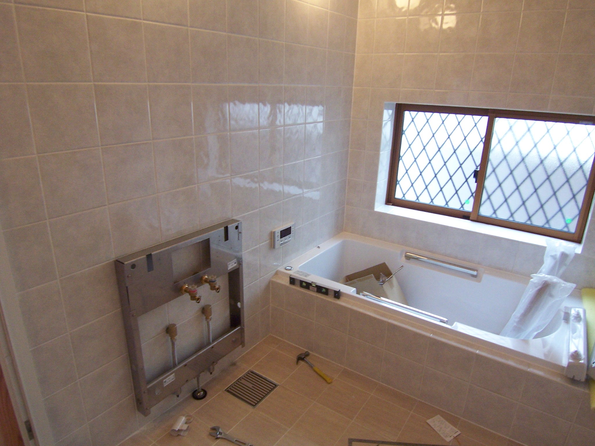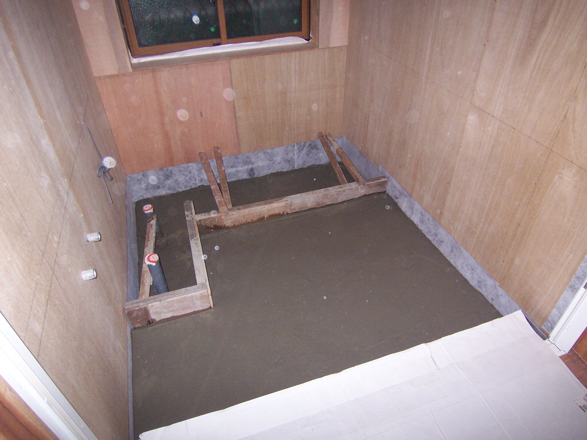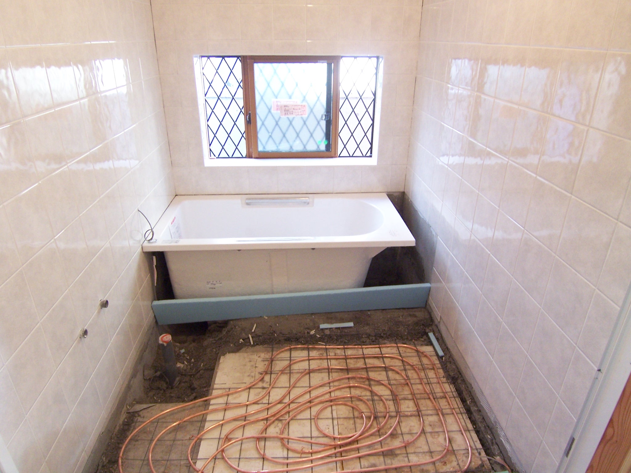 ○浴槽の据え付けと、洗い場に温水式床暖房の配管