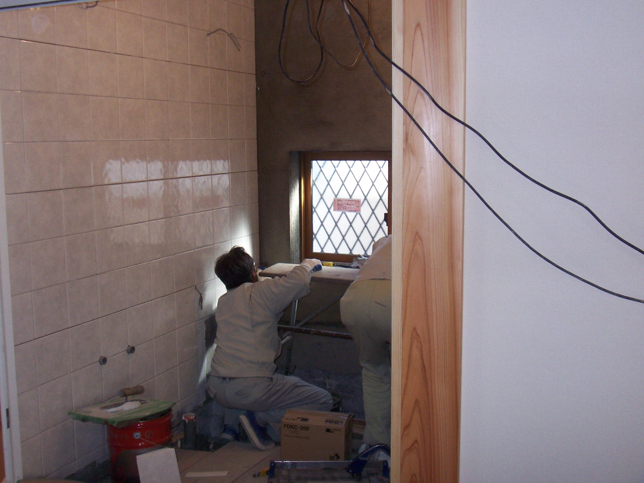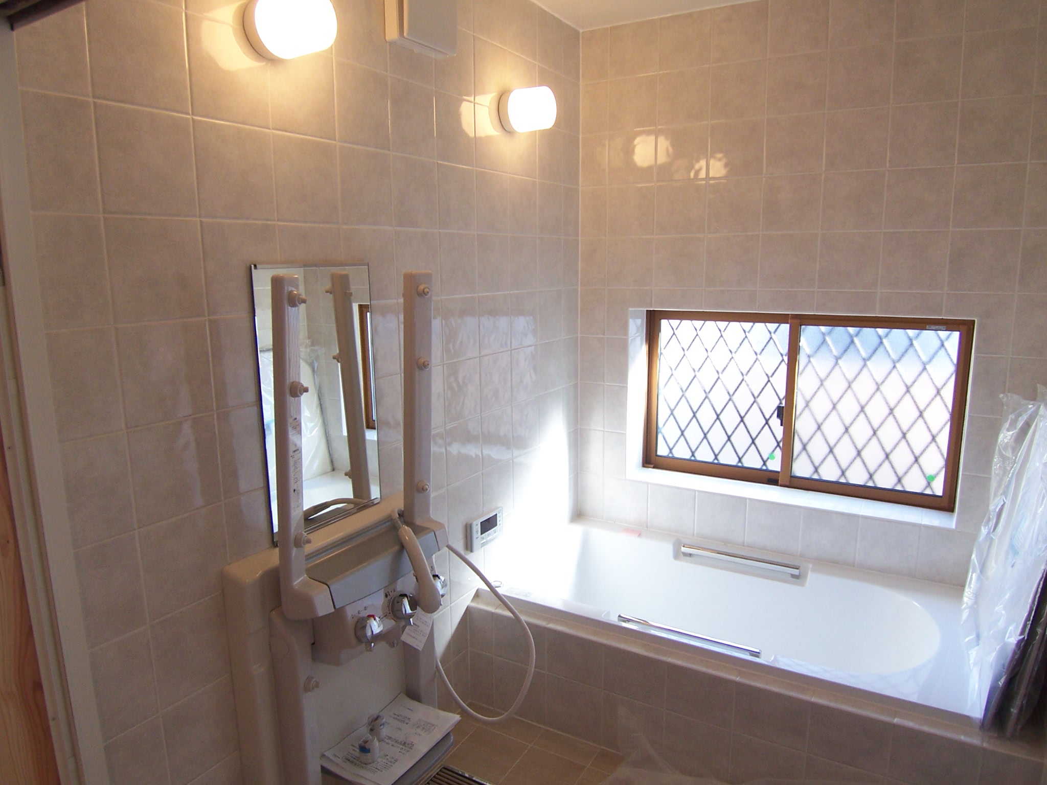 タイルの床、壁、特殊なシャワーユニットの取付、さらに、介護用リフトレールの設置。