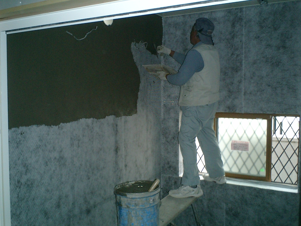 ○合板に、ゴム系の防水シートを貼り、下塗りのモルタルを施工