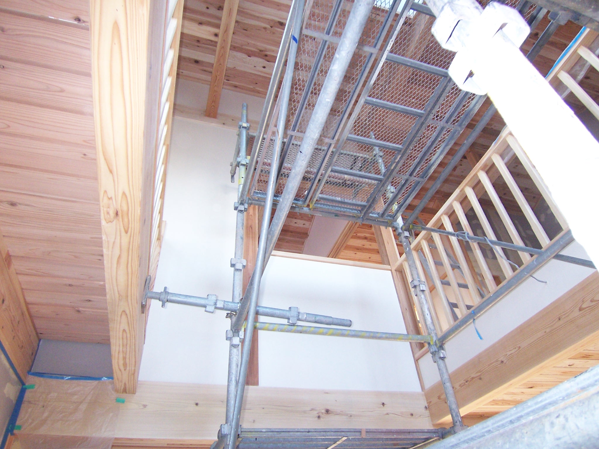 吹き抜け部分も内部足場を掛けて塗っていきます。