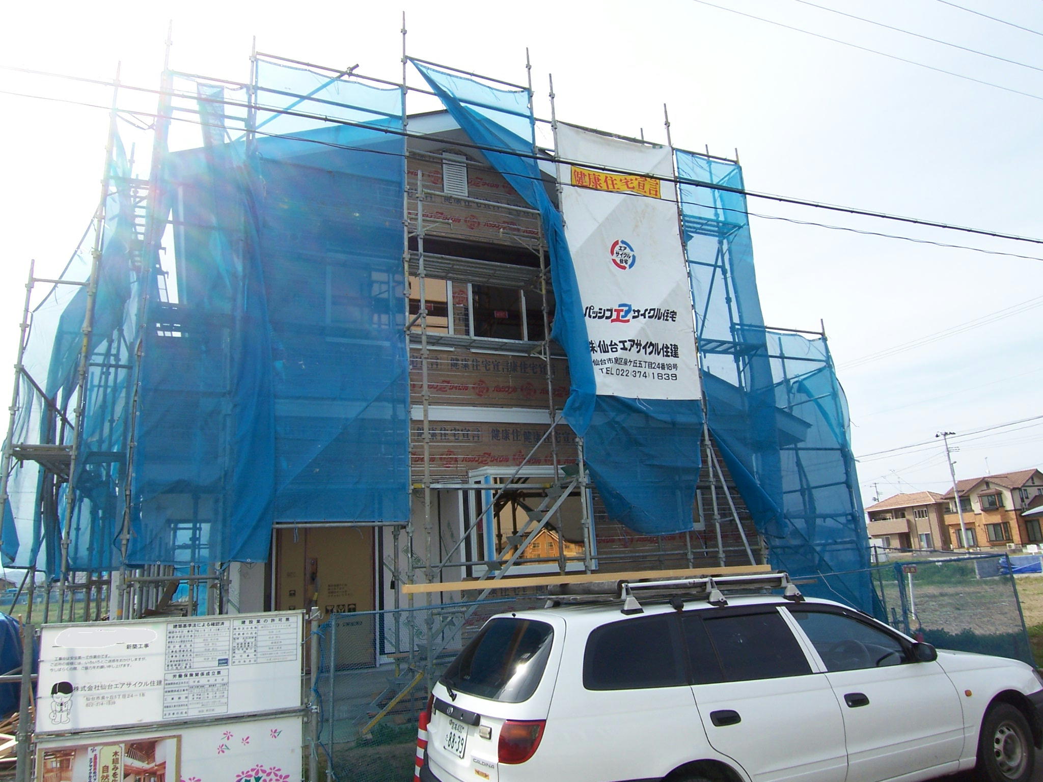 PAC専用のラスという金網をまず外壁の胴縁に固定して、そのあと下塗り専用の材料を塗り、