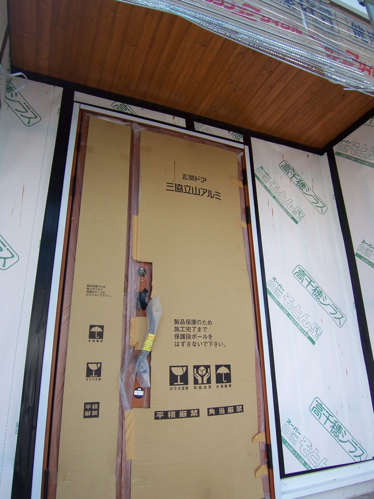 ↑玄関ポーチの天井には、ドアと同色で仕上げた板材を使ってみました。