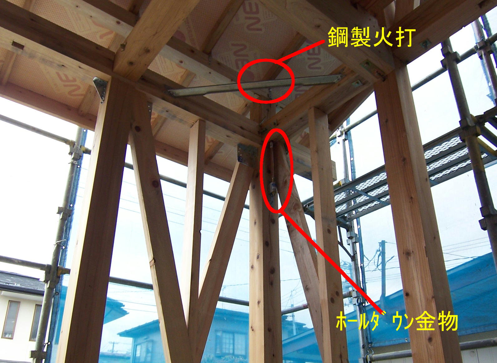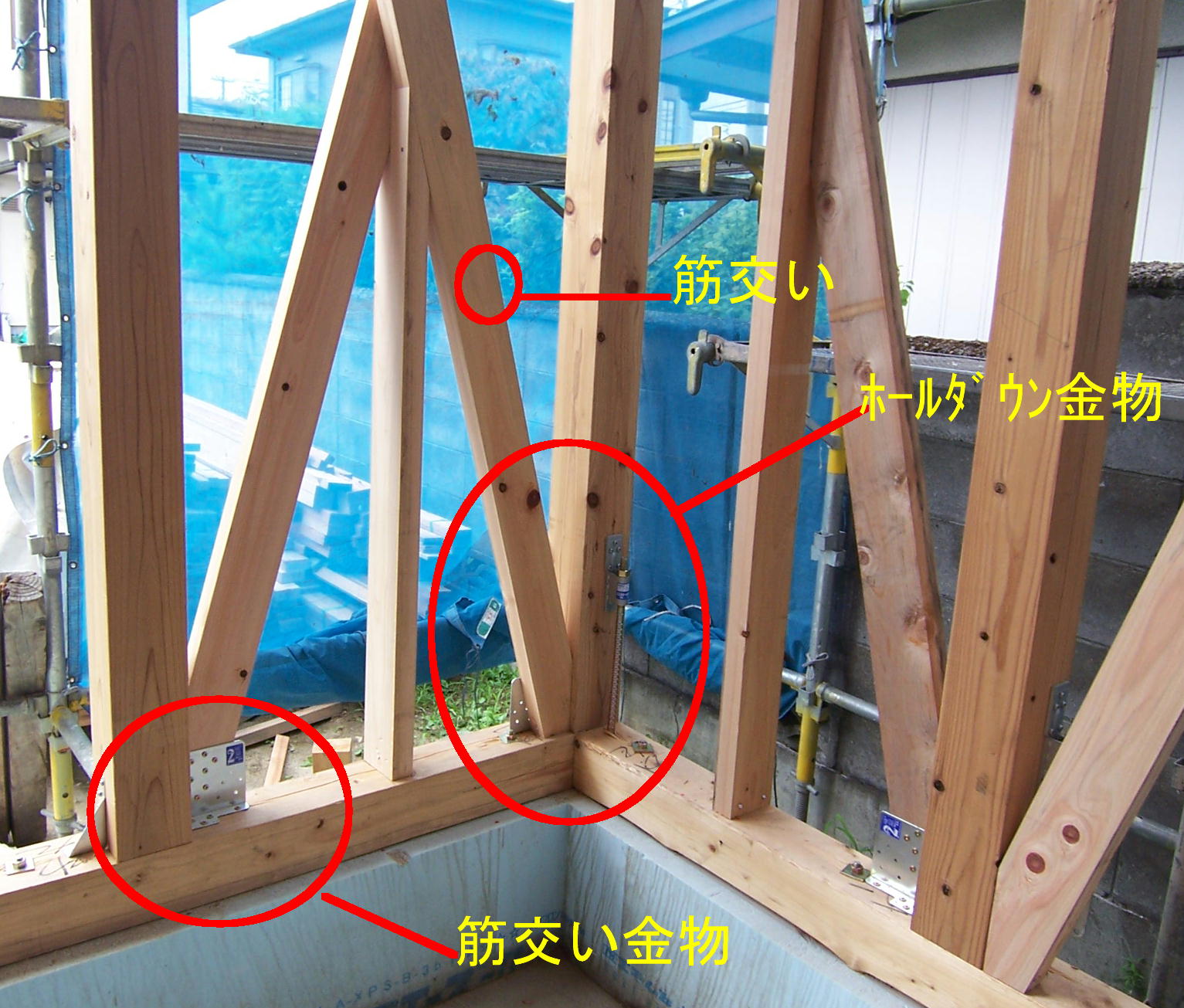 特に、地震に対して踏ん張る「筋交い」とそれを外れないように留め付ける「金物」なのです。