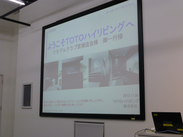 合同研修旅行 2012年12月01日 昨日今日と、リモデルクラブ宮城店会主催の合同研修旅行へ行ってきました。 場所は千葉県のシステムキッチン工場と新宿に先月3日オープンしたTOTO、DAIKEN、YKKapのコラボショールーム。