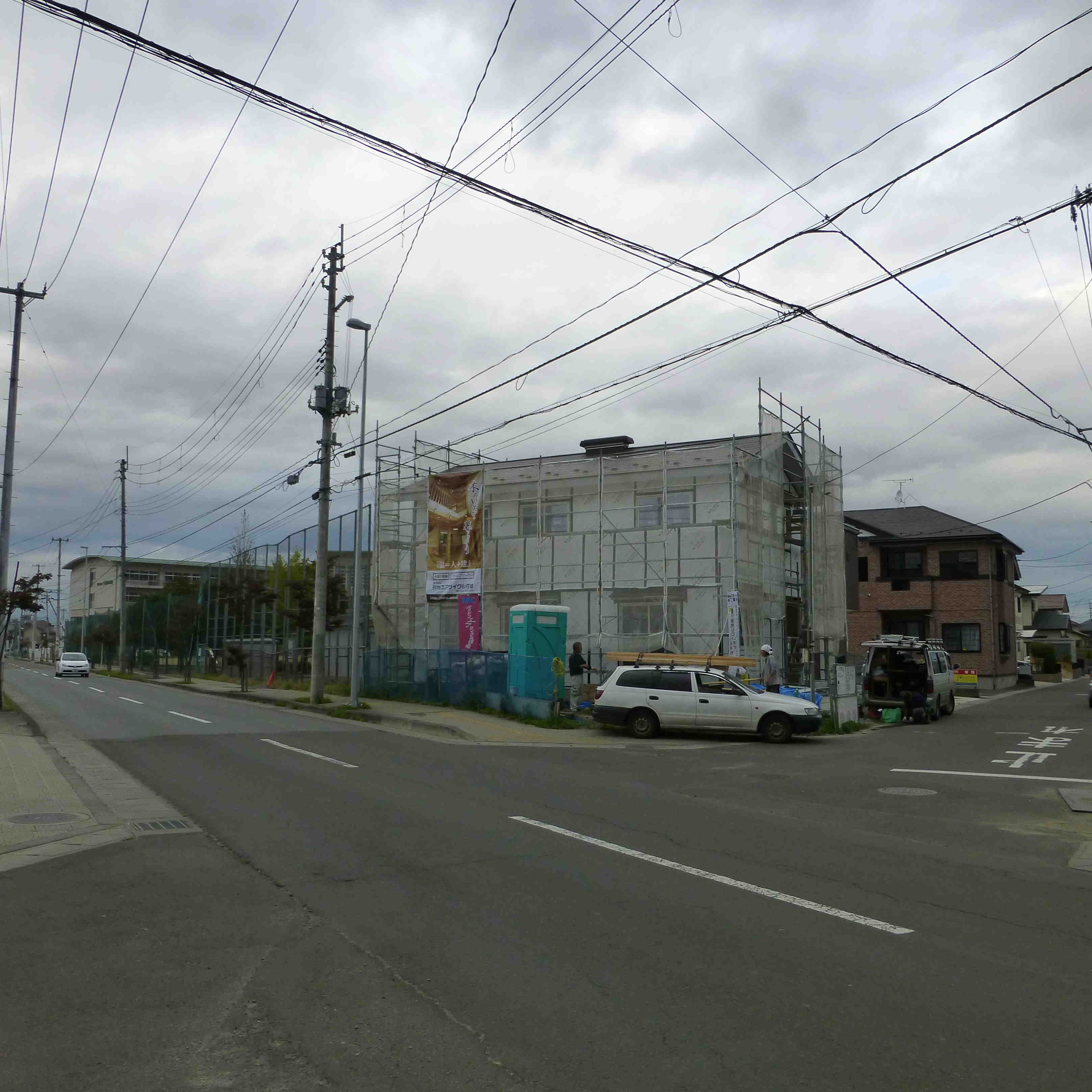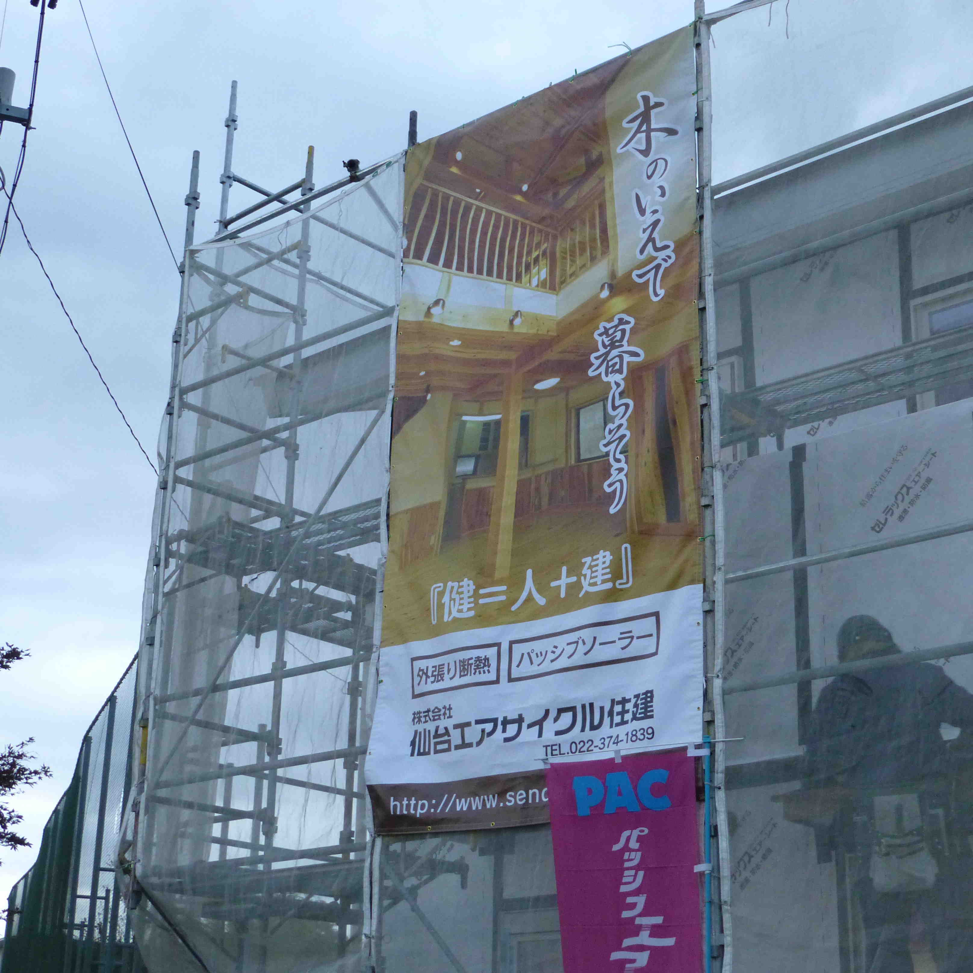 現場へRPシートを掲げました。 2013年10月19日 若林区荒井 七郷小学校隣で建築中のお住まい。 今まで会社の看板シートをかけていませんでした。 このたびPR用のシートを作ったので取り付けしました。 こんな感じです。 見つけていただけたら嬉しいです。