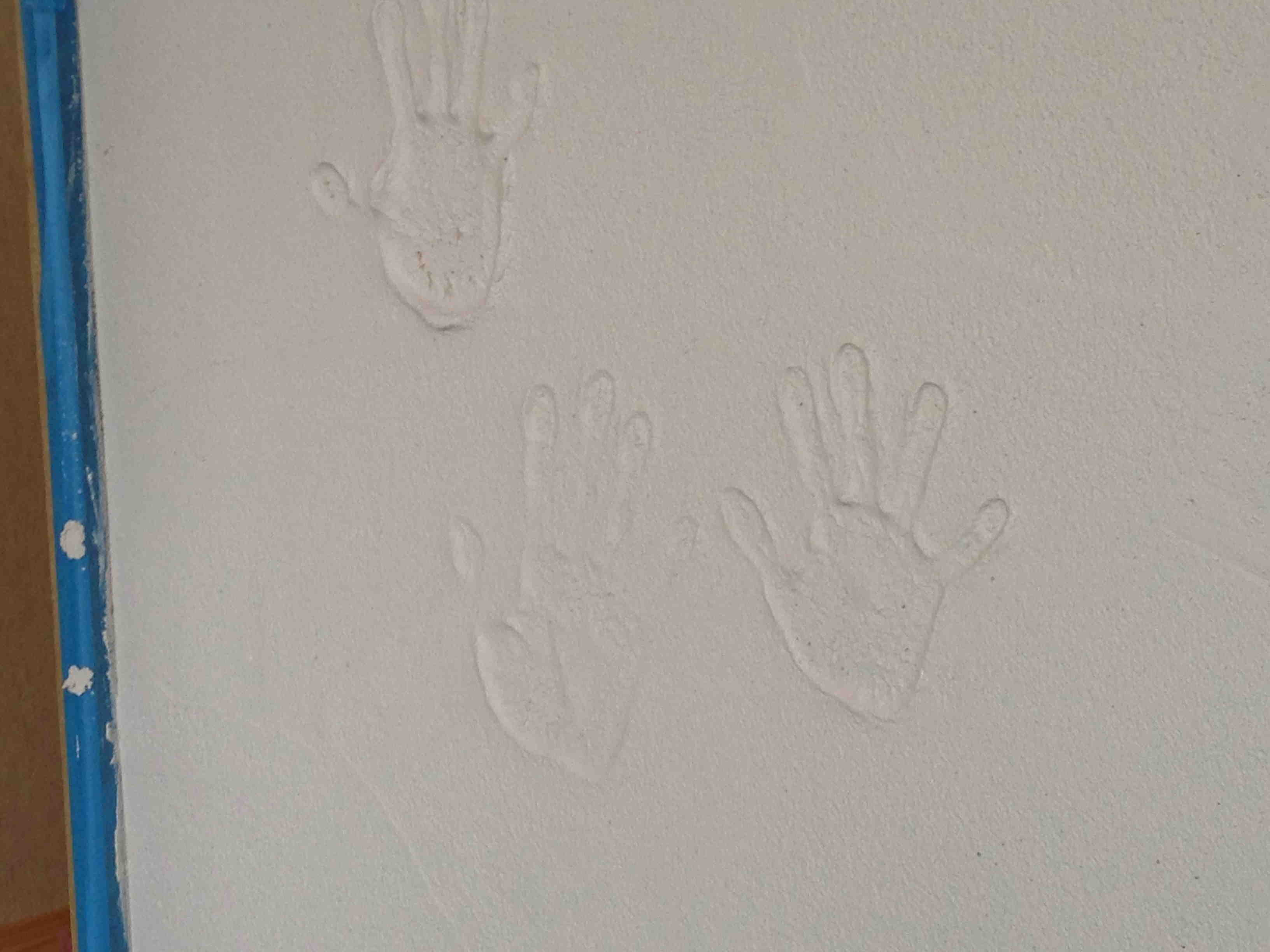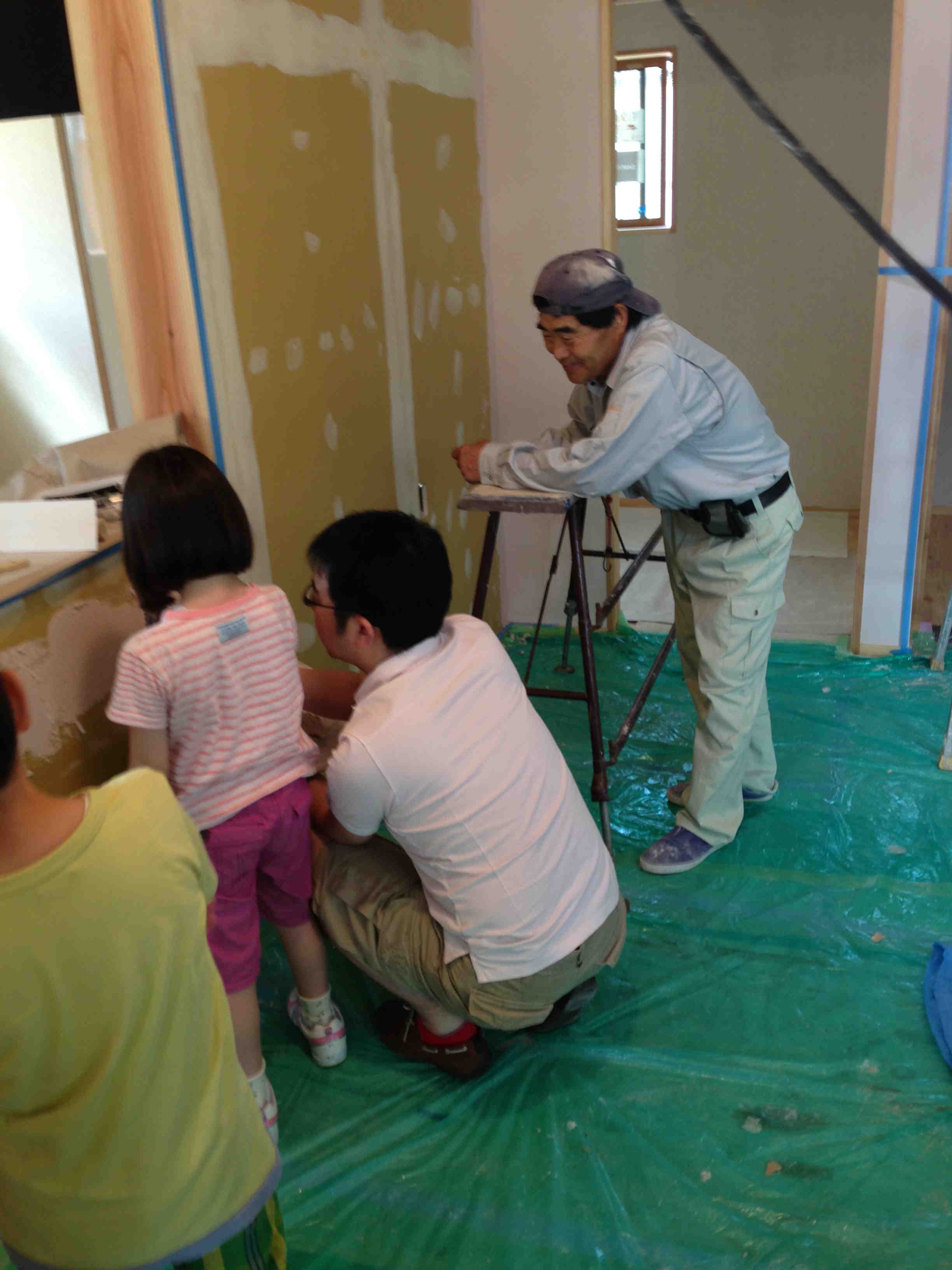 塗り壁体験! 2014年07月05日 建築中の旭ヶ丘の現場で、お子さん達の塗り壁体験。 最後に本職の左官屋さんに仕上げてもらった後は、「手形」です。 いつも使っている珪藻土の塗り壁材ですが、詳細はこちら