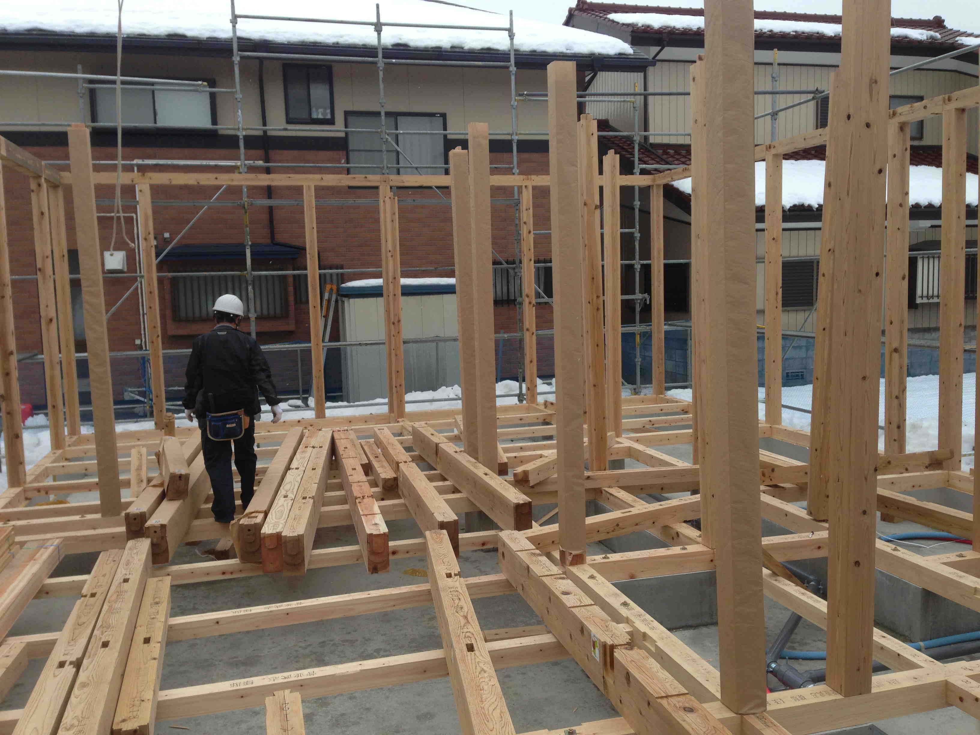 棟上げも無事済みましたが先週の週末はまた雪でしたね。順調に進んで欲しいです。
