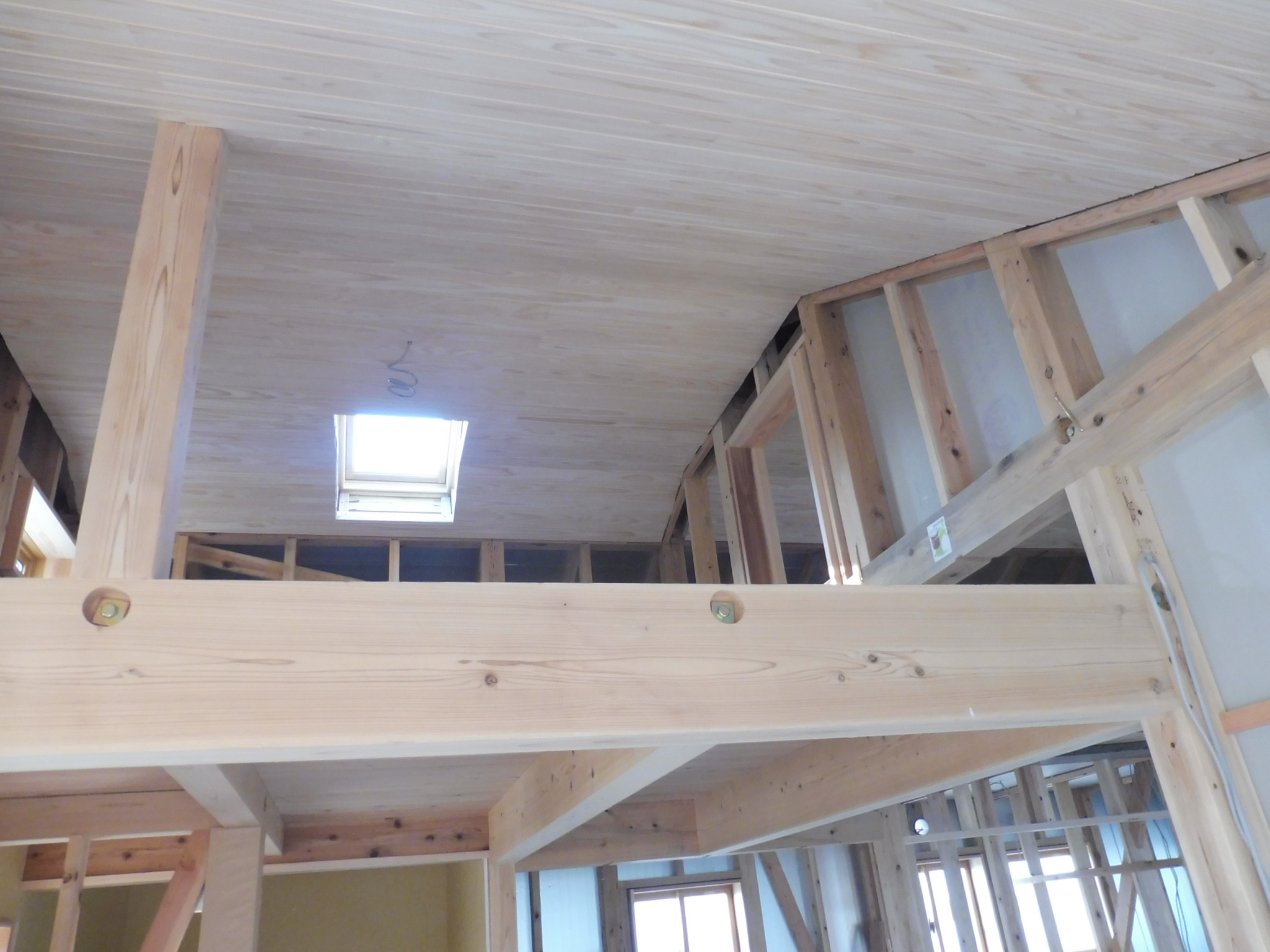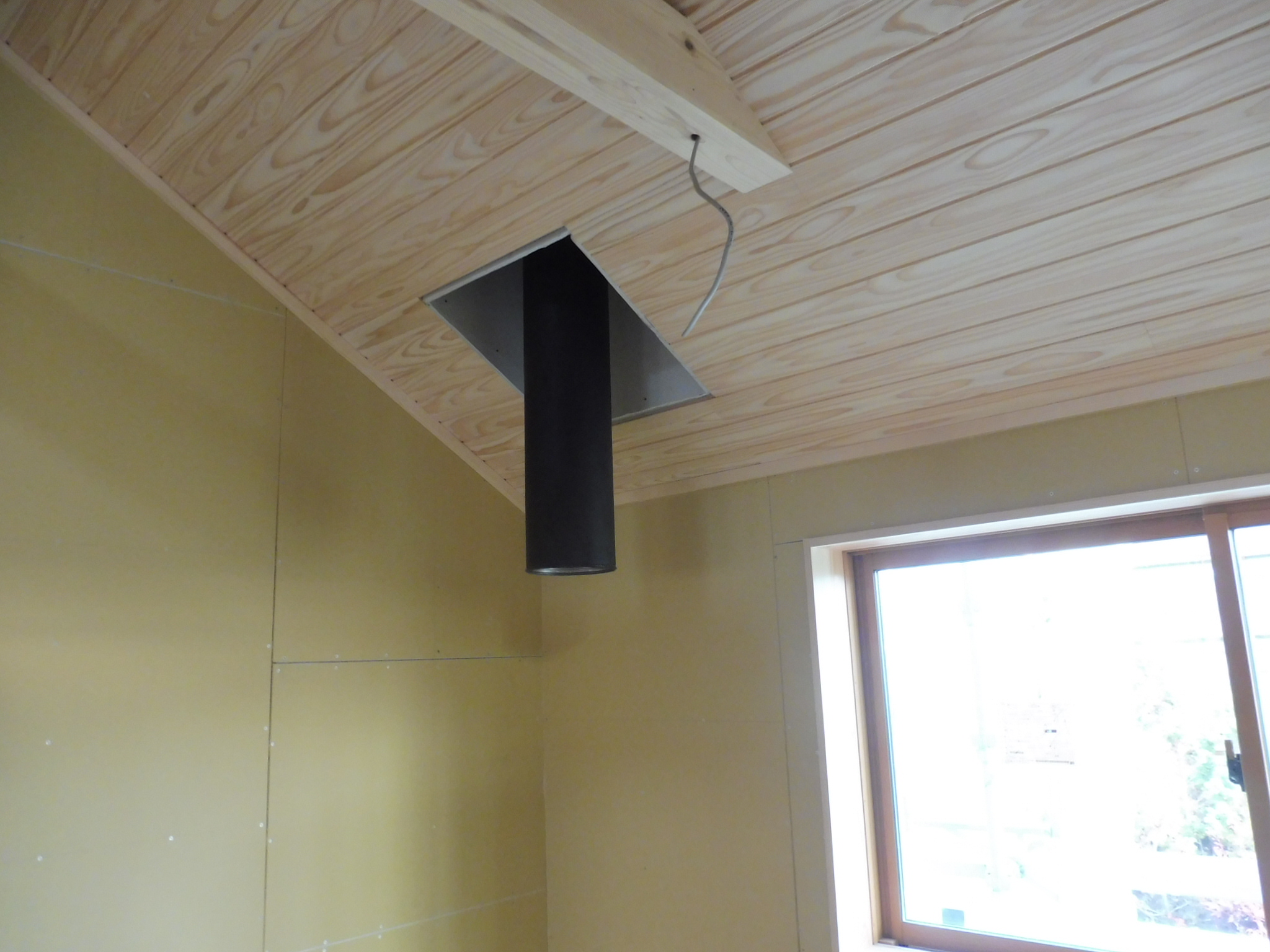 屋根なりの勾配天井が仕上がり、先行して取り付けていた黒い煙突が目立ちます。