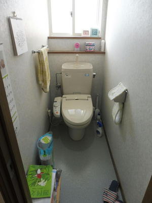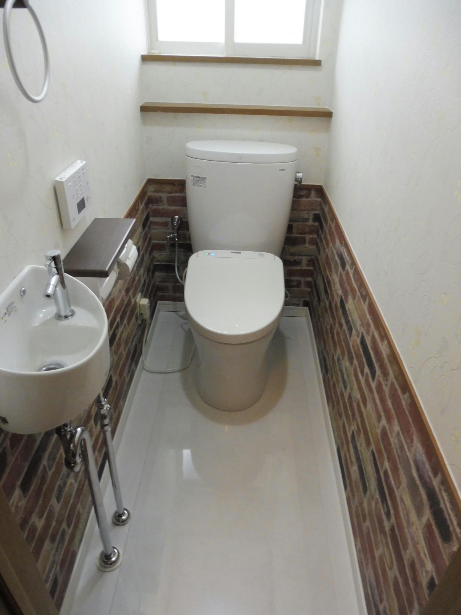 二階に水場が欲しいというご要望があり、節水型トイレへの交換・自動開閉するウオシュレットへの交換と供に水道配管を行って手洗いを設置しました。