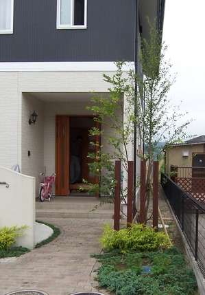植栽(樹木)が入ると引き立ちます。 2016年10月10日 西勝山の住まいはようやく植栽が入りました。 今年はお盆すぎから天候不順で雨が多く、植木屋さんも仕事がはかどらなかったそうです。 植栽計画はわたしが泉のJC(青年会議所)でご一緒していた女性の庭屋さんに依頼。いまふうの言い方で言えば「ガーデナー」ですかね。 玄関脇の植え込みスペースにようやく樹木が。 こちらは数年前に施工したお宅のシンボルツリー。