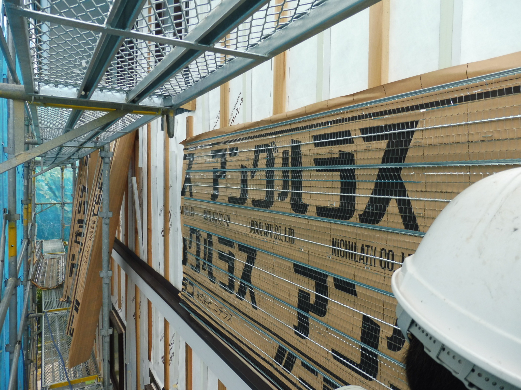 通気工法とするためにPAC工法でも使っている「アングルラス」という金網を張ってその上に下塗り材上塗り材を塗っていきます。上塗り材が固まる前に表面にパターンをつけていきます。
