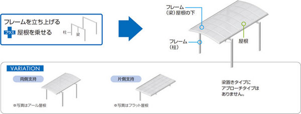 こちらは当社で新築したお住まいに設置した例。玄関ポーチから連続して屋根が掛かっていますが、支柱が屋根から離れているので車の取り回しが楽にできます。