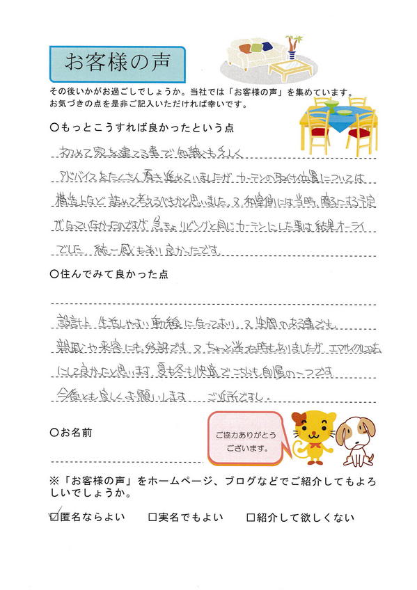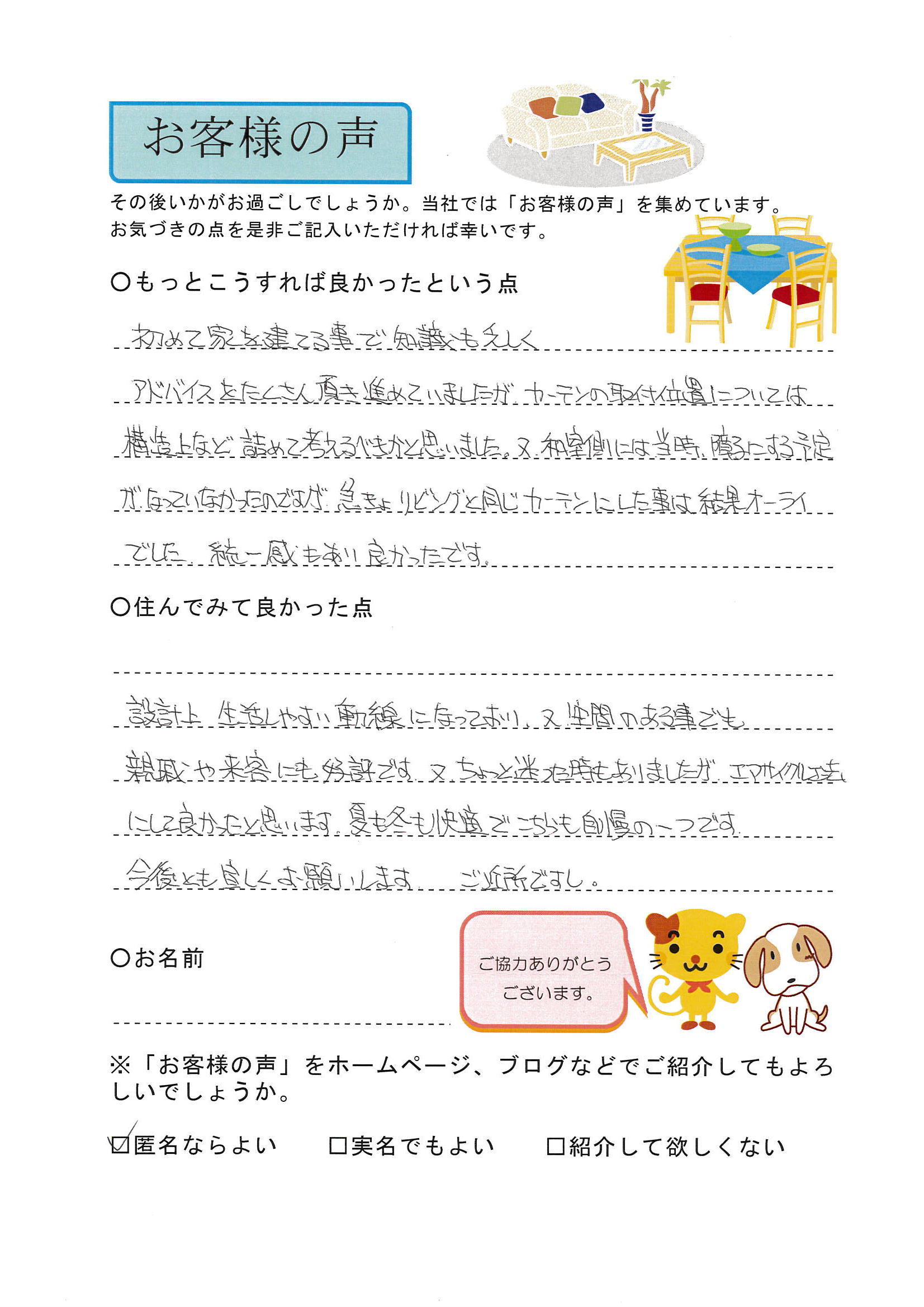 仙台市泉区の工務店。新築後のお客様の声は? 2017年06月11日 先週お伺いしたお客様から、「お客様の声」をいただきました。 ご意見ありがとうございます。本当にご近所ですので今後ともどうぞよろしくお願いいたします。 いつもブログをお読みいただきありがとうございます。 住まい作りに役立つガイドブックを無料で差し上げています。ご希望の方はこちらからお申し込みください。
