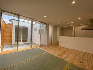 梅雨の晴れ間に、写真撮影。 2020年06月28日 月末に引き渡しの新築住宅。 施工協力している「シンプルノート仙台泉スタジオ」の住まいです。 外に閉じて中に開くというのがコンセプト。今日は午後から梅雨の晴れ間。青空が顔を出したのを捉えて写真撮影してきました。 内部の床には定番の桧無垢フローリング。リビングの一部に小上がりの畳コーナー引き出し付です。 畳は、国産泥染めの畳表を使用した「アトピッコハウス(株)のほんもののたたみ」®