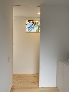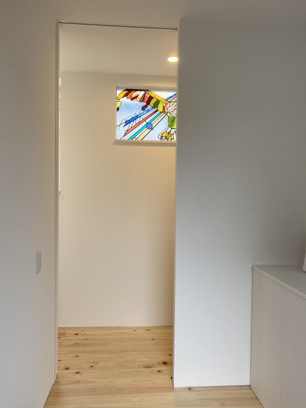 青葉区の新築住宅。お客様お引っ越しです。 2020年07月06日 青葉区西花苑で先月完成お引き渡ししたお住まい。 本日お引っ越しです。 天井の高さに設置したはめ殺し窓(FIX窓とも言いますが)には、お客様が特別に依頼した 「ステンドグラス」をはめ込む予定でした。 お引っ越しに合わせてデザイナーさんが搬入してもらい、設置を行いました。 設置前のFIX窓です。 玄関正面の引戸をあけると、、 正面に現れます。 鷲が舞い降りる姿?かな? きれいでした! こだわりをかなえられるところが、注文住宅の良さですね。