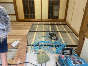 床下に調湿材を敷き込み、根太間には断熱材を施工。