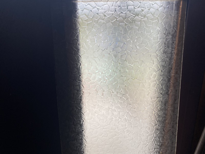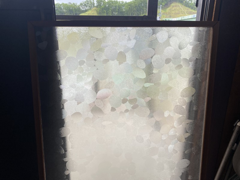「型板ガラス」と呼ばれるもので、現在は「梨地」という柄オンリーになってしまいましたが、昭和時代は紅葉や笹を形取ったものや、幾何学模様など様々なデザインが有りサンプルもありました。