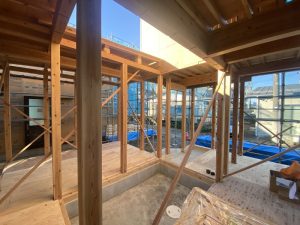 耐力面材(ダイライト)を張っただけの茶色い色でも明るいので、最終的に明るい外壁に仕上がったときにはさらに反射光が期待できそうです。西日に対しては日射遮蔽する位置に二階が配置されています。