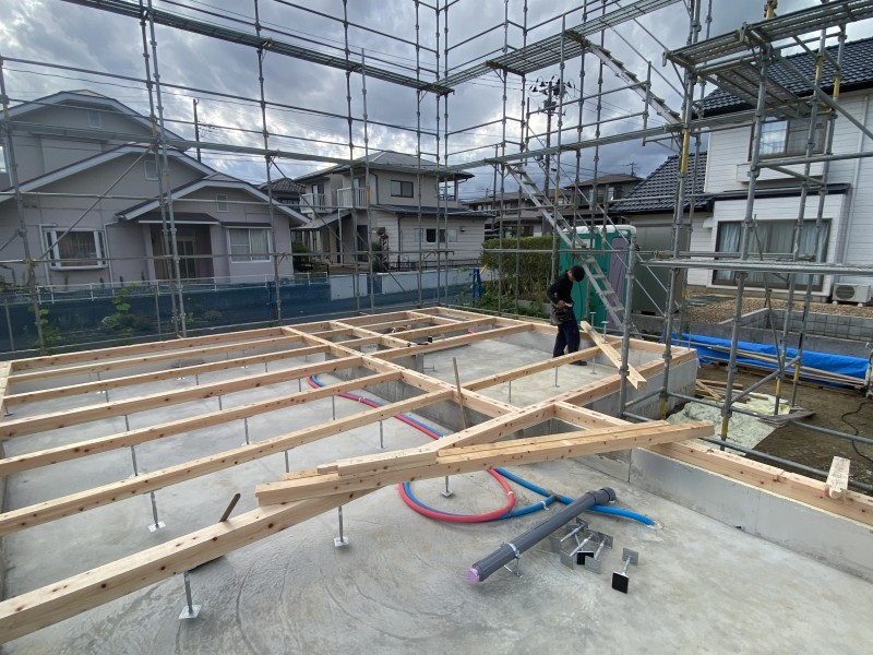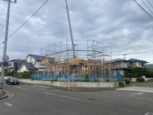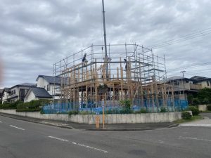 新築現場の建て方です。(宮城郡七ヶ浜町) 2023年09月25日 8月末に遣り方出しをした七ヶ浜町の現場。 今年の暑さは異常でしたね。いつもなら半日で終わる作業がⅠ時間ごとに休憩しないと耐えられないつらさでした。 基礎工事中も暑さが続きましたが土台敷と建て方の段階になってようやく秋の気配。 最近にしては大きめなお家になります。施工協力している「シンプルノート」物件。中庭のあるすまいです。