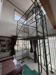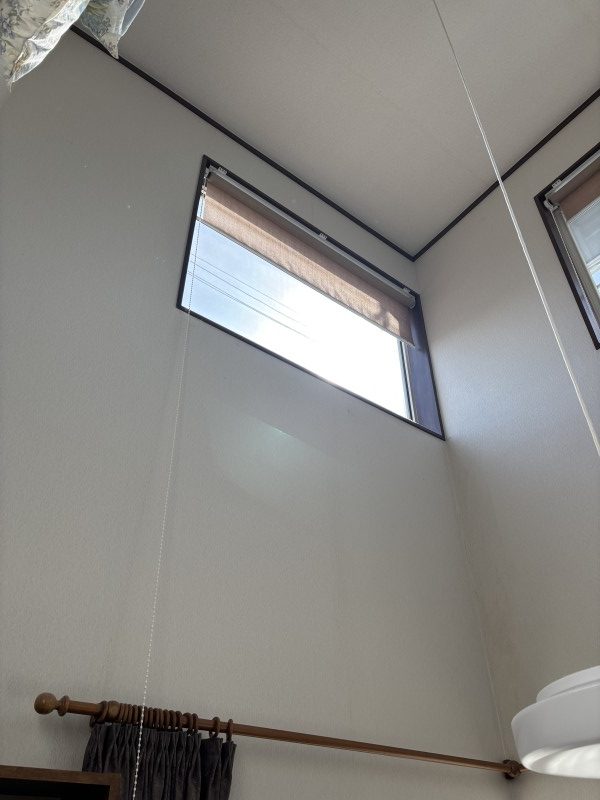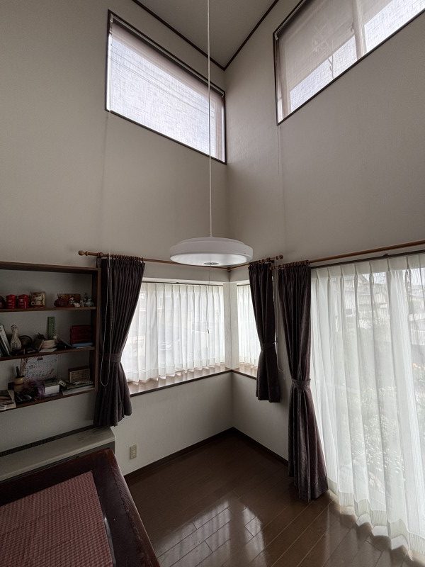 リビングの吹抜部分にはロールスクリーン、一階部分には新しいきれいなレースカーテンが入りました。