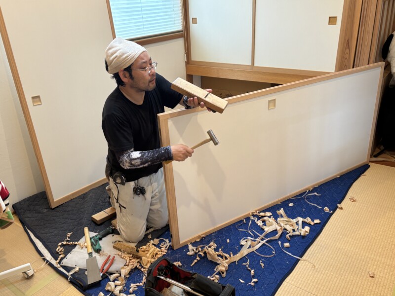 仕事をしてくれたのは若い建具職人。製作そのものは開口寸法を採寸し工場で行いますが、最後の取付は現場で行います。