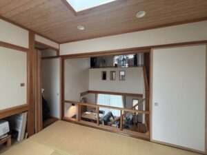 新築時に、リビングからのつながりを重視した中二階の和室。この仕切りには明るさを求めて紙張り障子を建て込んでいました。