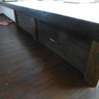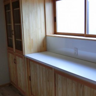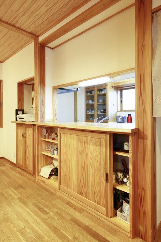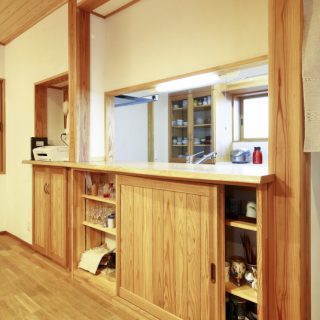 対面キッチンのカウンターです。材質はタモの無垢材ミミ付きです。輪染みができない特殊加工もお喜びいただいています。下部にリビング側からの収納をつくっていて、湯のみやグラスを収納するのにとても便利だとご好評です。