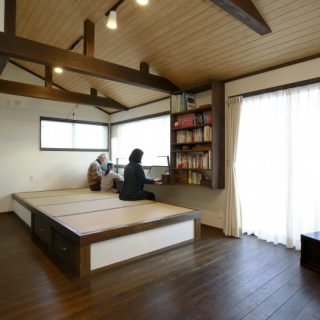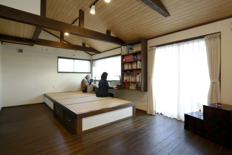 2階リビングは、中央に小上がり畳コーナー。窓側にタモの無垢カウンターがあり、みんなの勉強、仕事、読書など多目的なスペースとして利用されています。2階の床はスギのフローリングに着色しています。壁には和紙を貼っています。