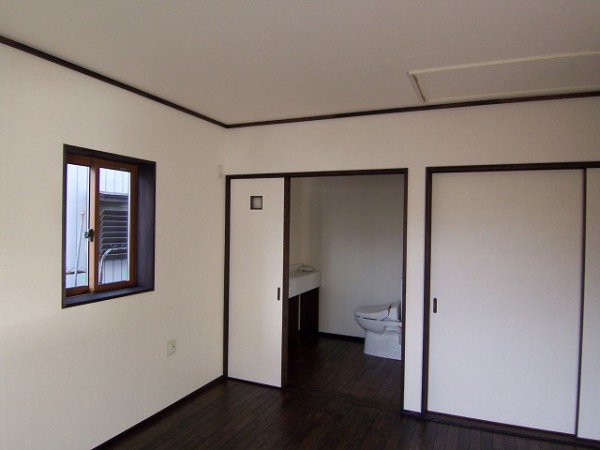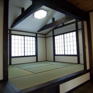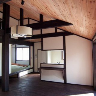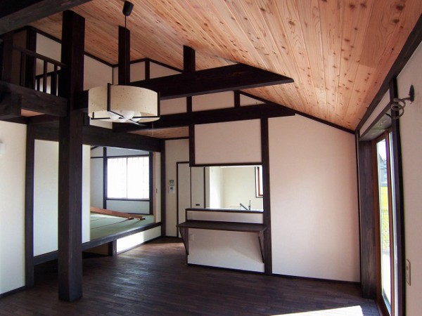 リビングの写真です。柱と梁は国産の杉材、床は国産無垢のナラを使用しています。今回は古民家風に、、、(和モダンに)というご要望で着色はオスモの塗料を用いました。壁は土佐和紙、天井は秋田杉を貼っています。存在感がある大黒柱は7寸角の杉です。当社の資材置き場に10年間保管していた逸品です。(まさか黒くなるとは思っていなかったのですが・・・)