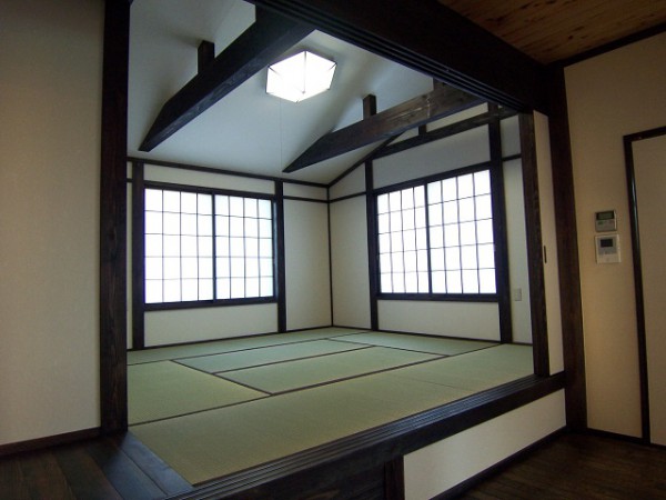 リビングに隣接する和室です。車椅子から移乗しやすいように、という意図であえて段差をもうけています。床下に収納をとる関係で、畳は薄めにしました。(アトピッコハウスのゼロホルム畳、畳表は減農薬天然泥染めの国産イグサ)天井は勾配天井とし、梁をあらわすことで高さを確保しています。