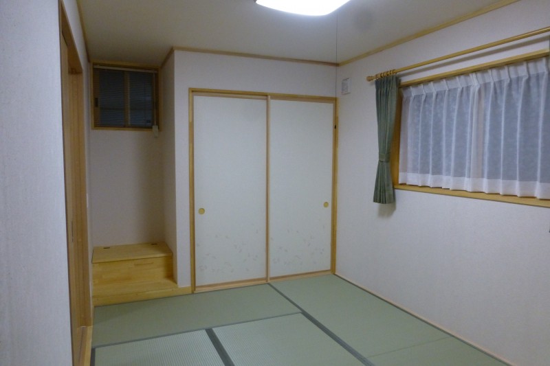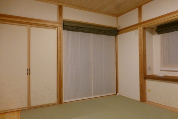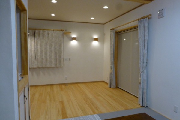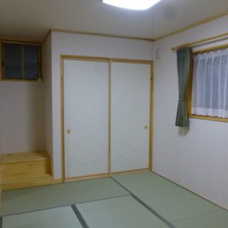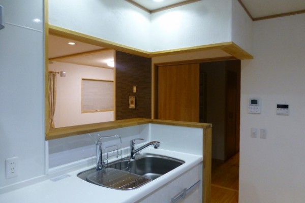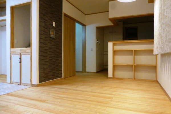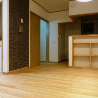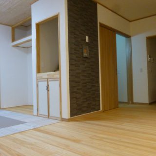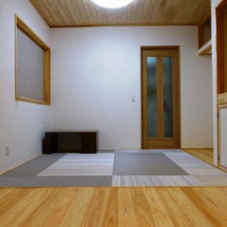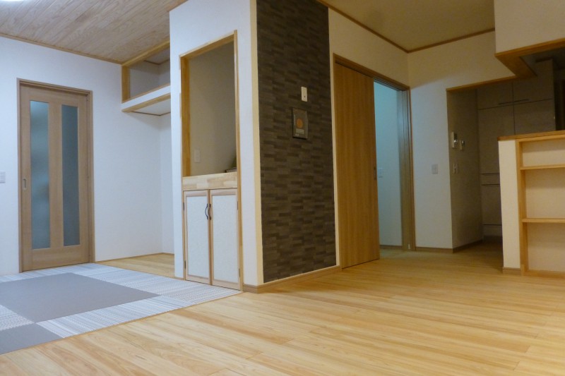 壁掛けテレビを設置する壁の側面には、小さめの仏間を配置しました。キッチン、リビングダイニング、畳コーナーとL型に広がる家族空間です。足触りが気に入っていただいたのでフローリングは檜の無垢材を使用していますが、木を主張しすぎないようにとのご希望からほぼ節のないものを張っています。