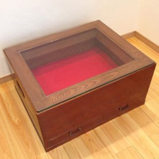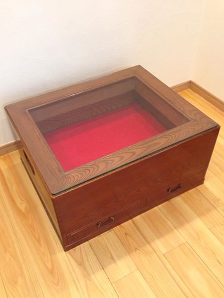 お火炉です。 工事のご依頼をいただく際、お婆ちゃんの旦那さんが大切にしていたお火炉をちょっと加工出来ないかと相談されていました。灰を抜いて毛氈を敷きテーブルトップとしてガラスを乗せショーケース兼テーブルとしてみました。昭和20年代、給料一ヶ月分の代金だったそうです。北六番丁にあったユノメさんから買ったんだとおっしゃってました。