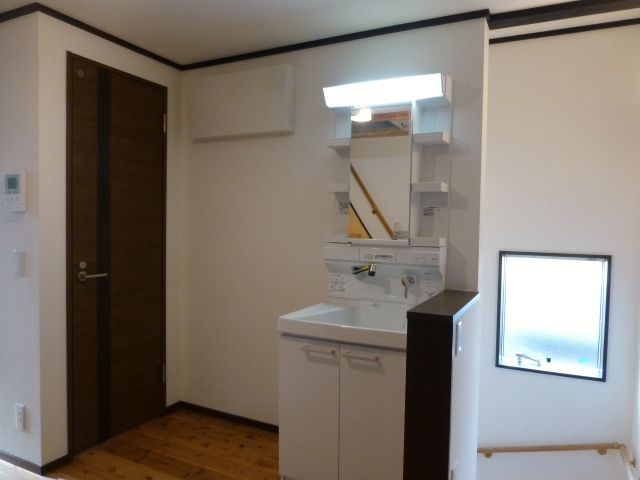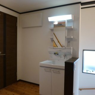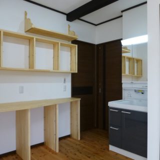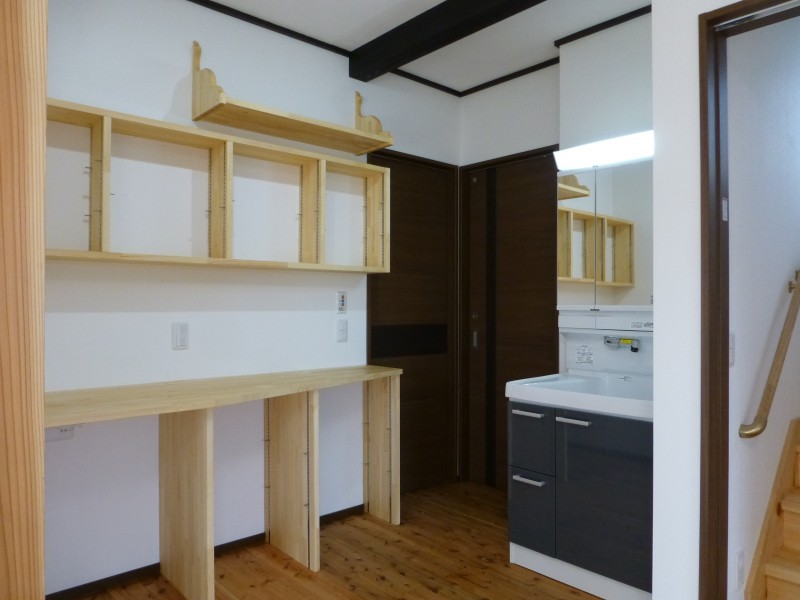 階段の横には洗面化粧台があります。なぜわざわざ洗面所から出してここに置いたかというと、、、 こちら、実は「カットスペース」なんです。奥様は美容師さん。子供たちの髪を切るスペースが欲しいとのご要望でした。当初は「鏡があれば」といったお話だったのですが、洗面台を置いてしまったほうが、ちょっと手を洗ったりするのに便利ではないかという事で、この形になりました。(シャンプーまでは想定していません)
