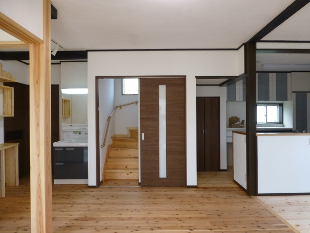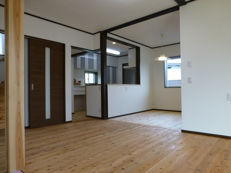 リビングです。基本的にはワンルームの空間となっています。床は杉の無垢材。ダイニングスペースは桧の無垢材を使っています。 床に座ったり、肌触りの点では、やわらかく暖かい杉のほうがよく、椅子を使う場所では適度な硬さがある桧を使いたいというご要望でした。 天井には、高性能珪藻土のはいから小町を採用。壁はお子さんが小さいので、将来的な貼り替えも念頭において一般的なエコクロスの仕様をご希望されました。柱、梁は、お選びになった建具の色に合わせて茶系の着色を行いました。(自然塗料です)